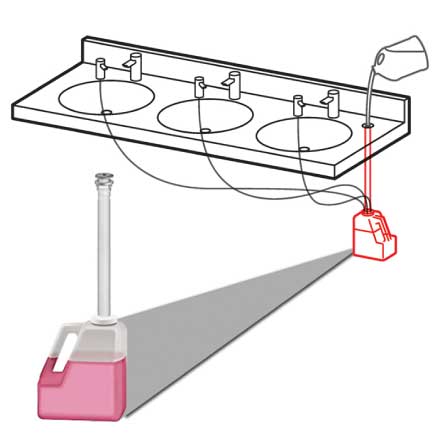 - Tank is located under counter and connected to soap distribution tubing and EZ Fill™ Top-Fill Port. Both are connected via a flexible fiber-reinforced soap fill hose. Unit made of polished chrome plated brass.